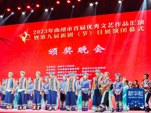 這是曲靖市2023年首屆優秀文藝作品匯演暨第九屆新?。ü潱┠空寡蓍]幕式現場。