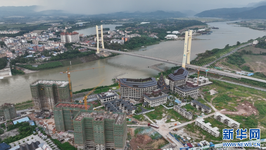 航拍視角下,正在建設中的景洪市國際醫療旅游先行區與西雙版納傣族園景區隔江相望(9月14日攝)。新華網發(劉云 攝)