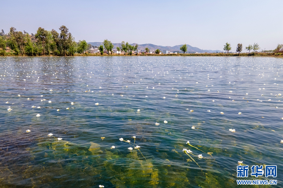秋天,在云南省大理白族自治州洱源縣右所鎮的千畝人工海菜種植基地里,白瓣黃蕊的小花開滿水面,星星點點,美不勝收。
