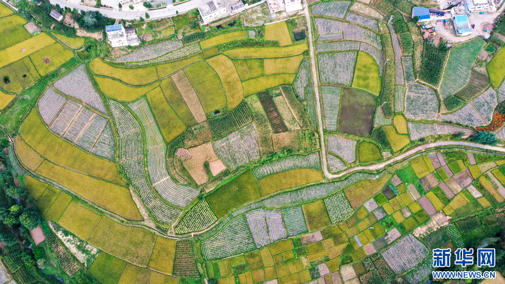 俯瞰稻黃鄉村美(9月25日攝)。新華網發(孫文來 攝)