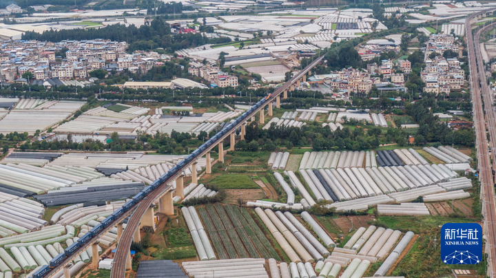 10月8日,“滬滇·瀾湄線”國際貨運班列駛出昆明市王家營西站(無人機照片)。新華社記者 胡超 攝