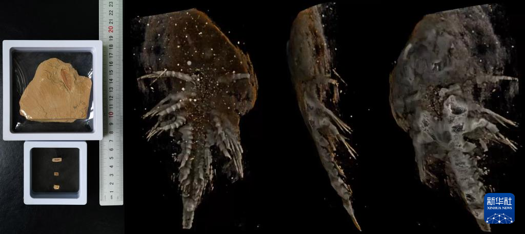 拼版照片:左邊為不同生長時期的迷人林喬利蟲,右邊為劉煜團隊拍攝的迷人林喬利蟲不同方位的CT圖(10月11日攝)。新華社記者 陳欣波 攝