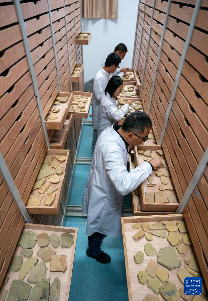 10月11日,劉煜(前)帶領學生在化石存放庫里挑選化石。新華社記者 陳欣波 攝