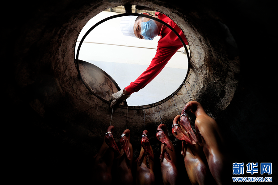 蘭紅江把鴨子放入烤爐(攝于5月17日)。新華網 趙普凡 攝