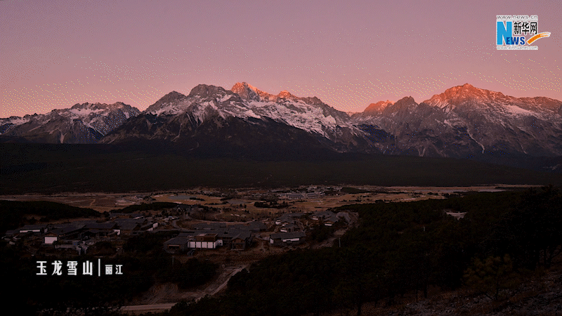 日出時,玉龍雪山被逐漸點亮,身披金光