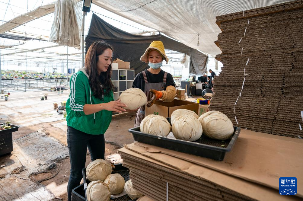 10月18日,李思敏(左)在位于晉寧區寶峰街道的多肉植物直播基地內幫助同事打包裝箱。新華社記者 陳欣波 攝