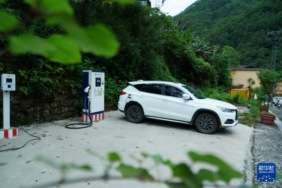 一輛新能源車在云南省貢山獨龍族怒族自治縣獨龍江鄉的充電樁充電(5月19日攝)。新華社發(張建升 攝)