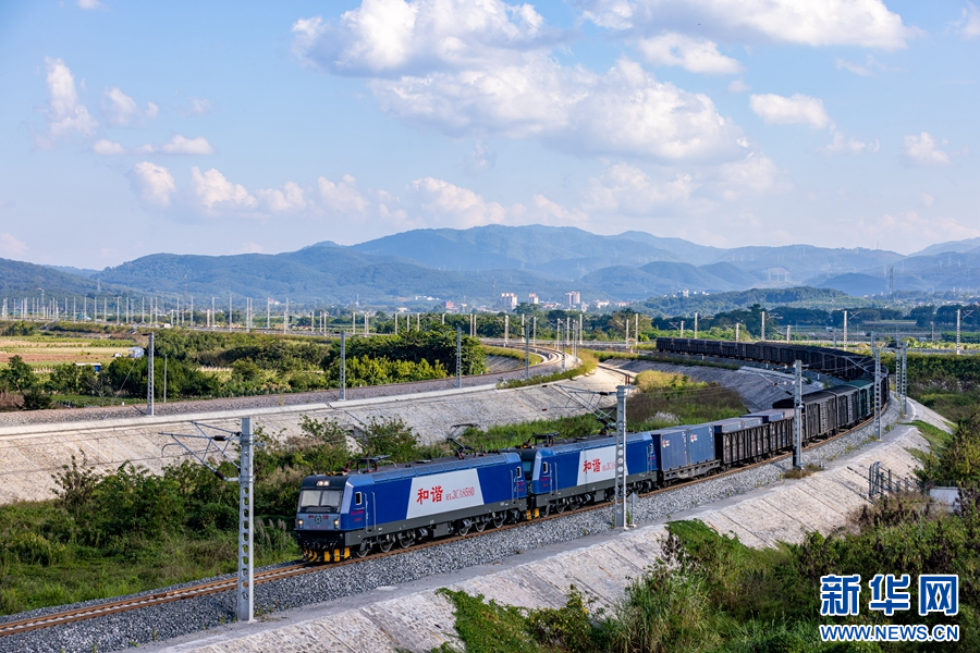 10月8日,“滬滇·瀾湄線”國際貨運班列從昆明市王家營西站駛出。新華網 趙普凡 攝
