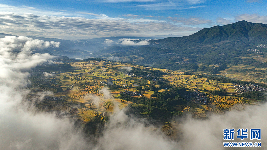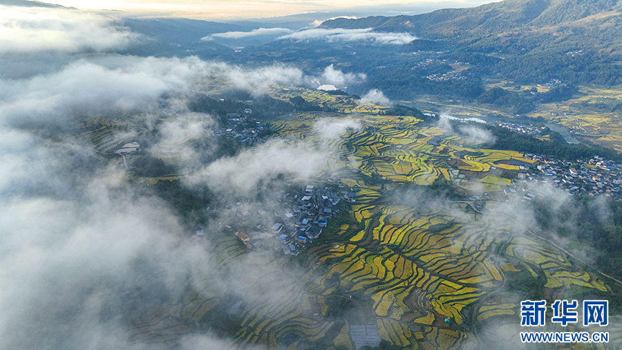 在龍江鄉拍攝到的云霧下的美麗稻田(10月24日攝)。新華網發(楊磊 攝)