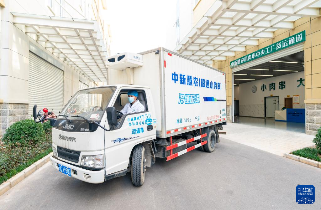 11月3日,在昭通市昭陽區中新慧農供應鏈小肉串中央工廠,工作人員駕駛冷鏈車運輸小肉串。新華社記者 陳欣波 攝