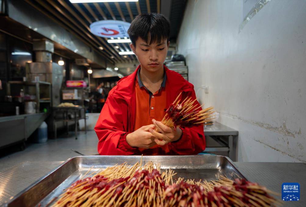 11月2日,一名小肉串燒烤從業人員在昭通市昭陽區一家燒烤店內數小肉串。新華社記者 陳欣波 攝