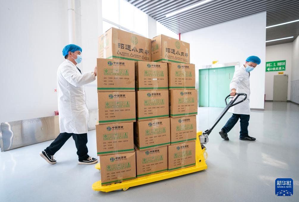 11月3日,工作人員在昭通市昭陽區中新慧農供應鏈小肉串中央工廠搬運小肉串。新華社記者 陳欣波 攝