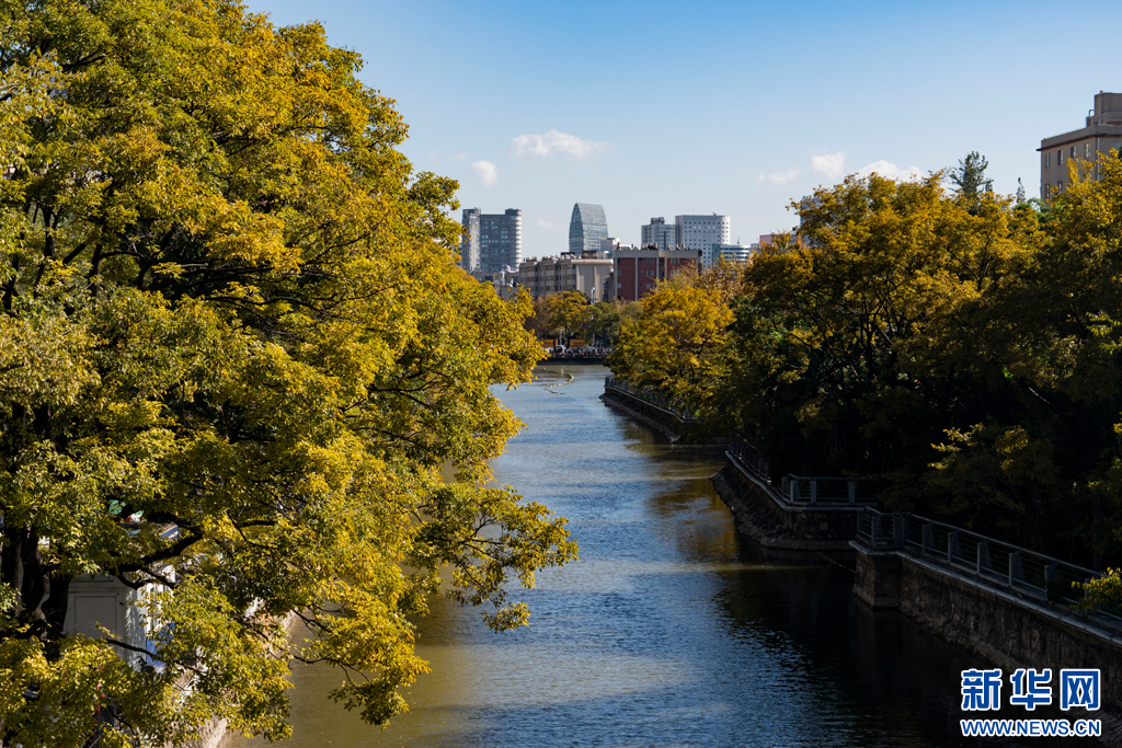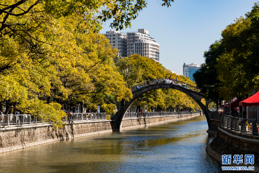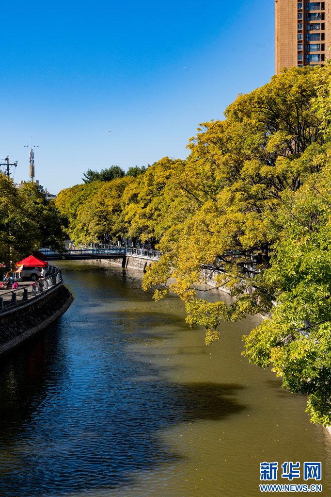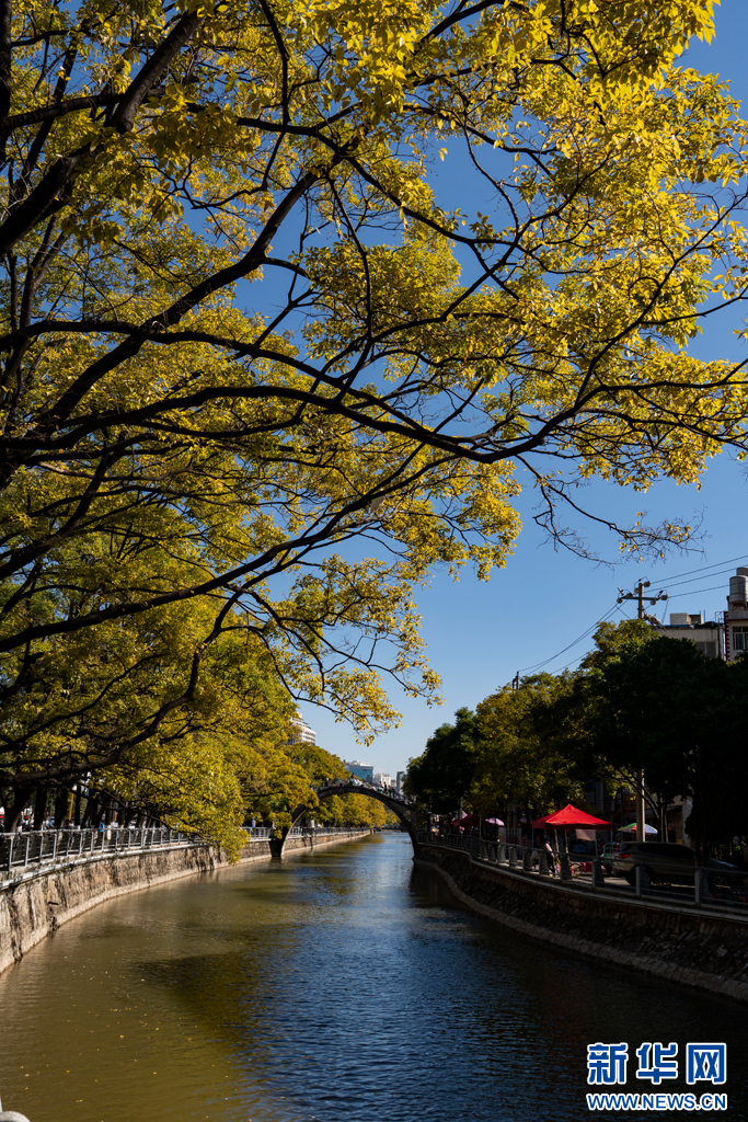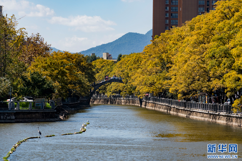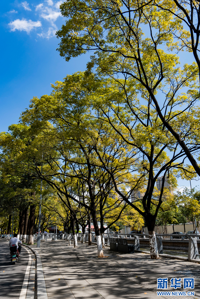 近日,位于春城昆明大觀河兩岸的滇樸滿樹金黃,將整條河道裝扮得美如詩畫。游人漫步大觀河岸,風清氣爽愜意游玩。