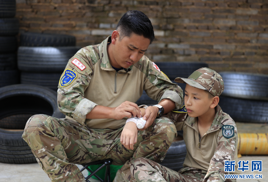 劉易瑋教訓練營的孩子們繃帶包扎法(8月2日攝)。新華網 趙普凡 攝