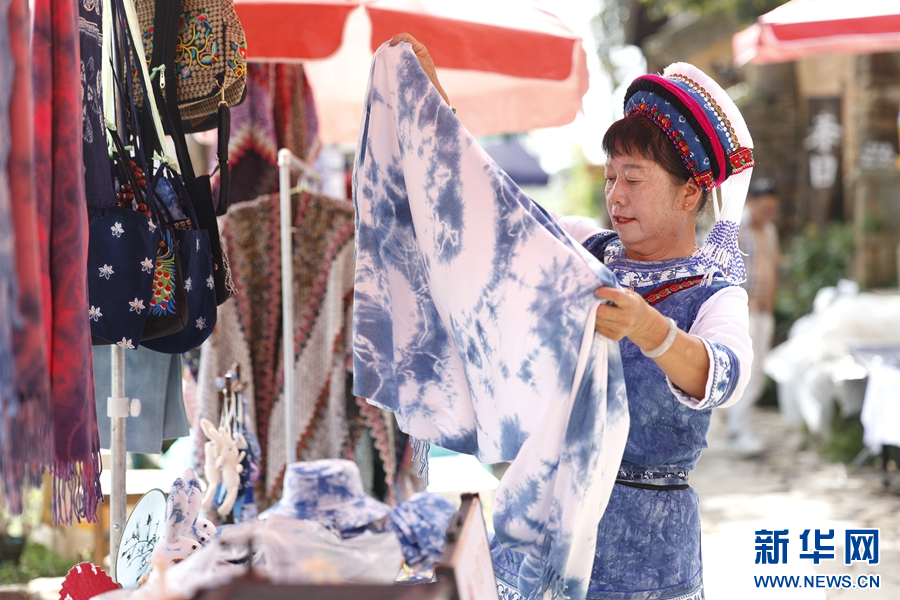 龍素云正在整理攤位上的扎染(攝于9月19日)。新華網 趙普凡 攝