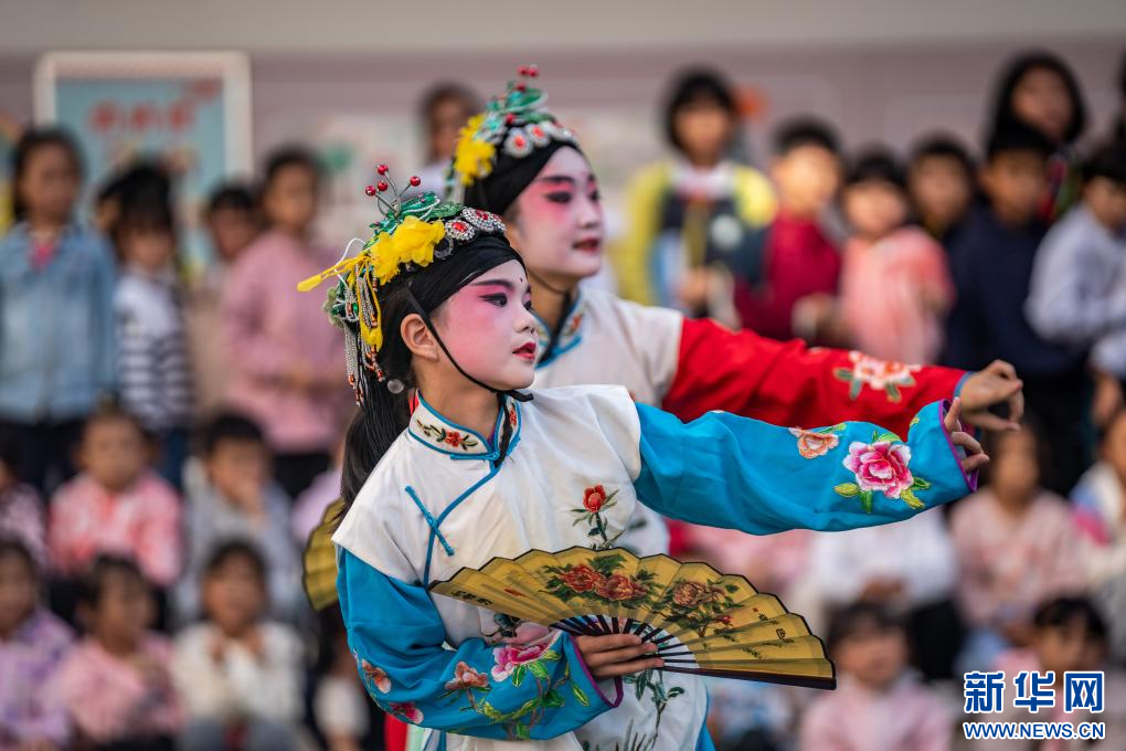在云南省昆明市五華區文林小學,少兒滇劇傳習班的小演員在表演節目。