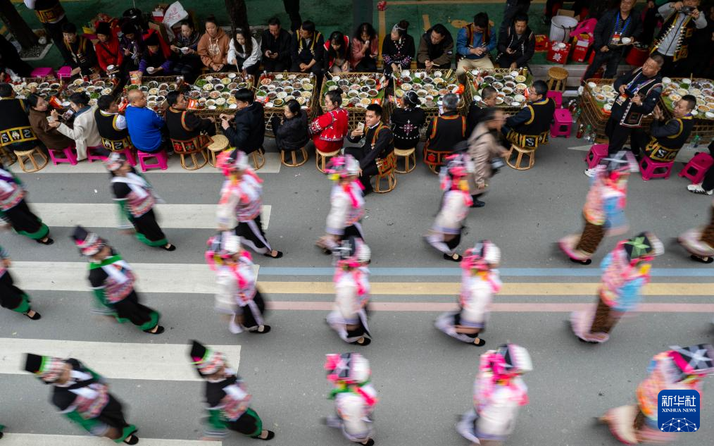 11月19日,綠春縣哈尼族群眾與游客一起品嘗哈尼長街古宴,巡游展演隊伍從一旁經過(無人機照片)。新華社記者 陳欣波 攝