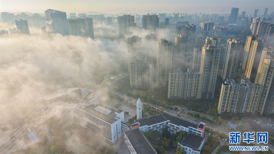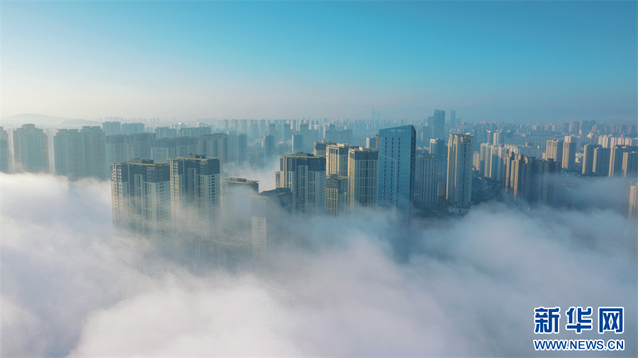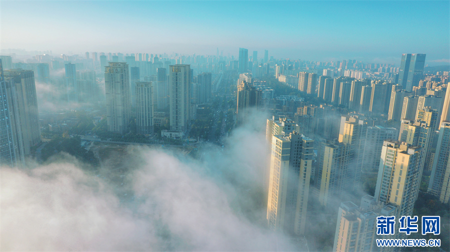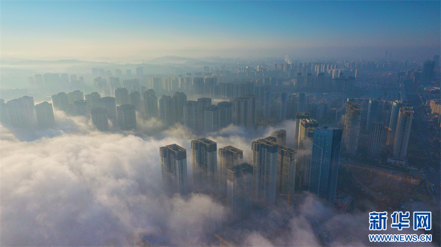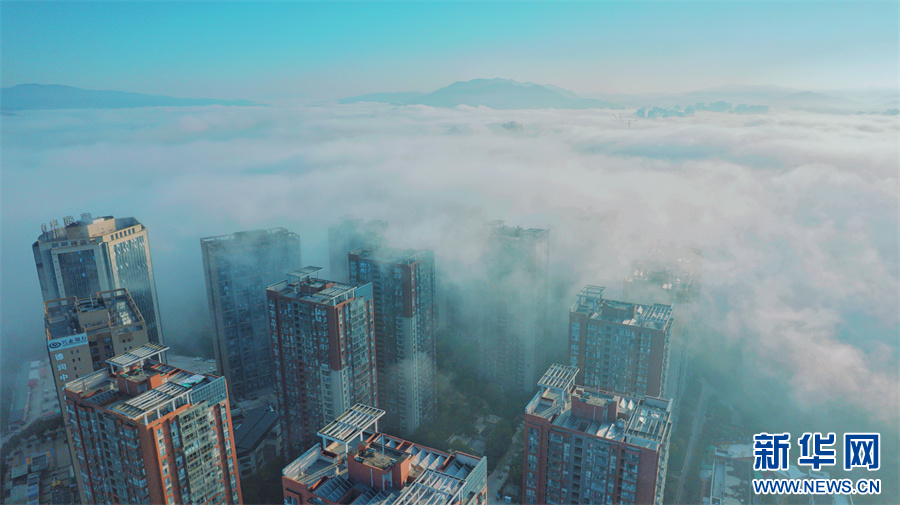 云霧與城市勾勒出一幅奇幻的冬日美景(11月20日攝)。新華網發(楊景浩 攝)