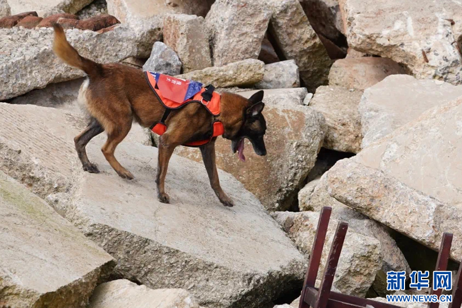 搜救犬廢墟搜救(11月19日攝)。新華網發(云南省消防救援總隊供圖)