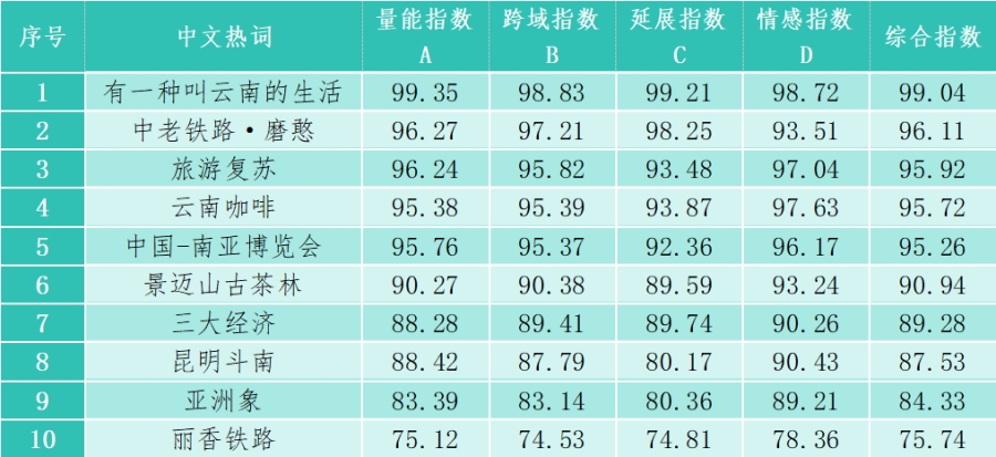 其中,“有一種叫云南的生活”“中老鐵路·磨憨”“旅游復蘇”綜合指數位居前三。