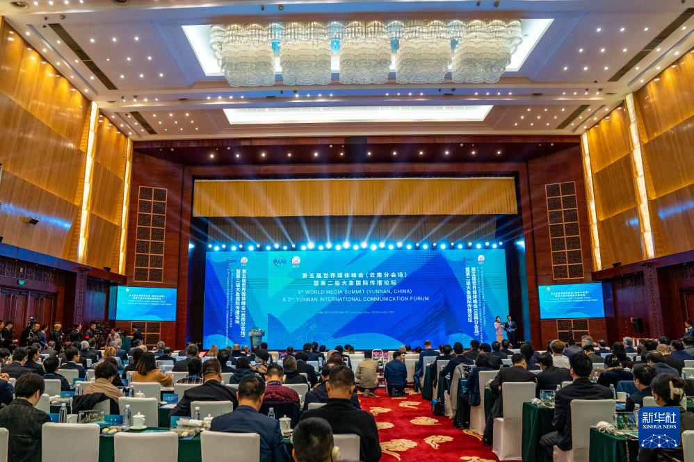 這是12月5日在云南昆明拍攝的第五屆世界媒體峰會(云南分會場)暨第二屆大象國際傳播論壇開幕式現場。新華社記者 胡超 攝