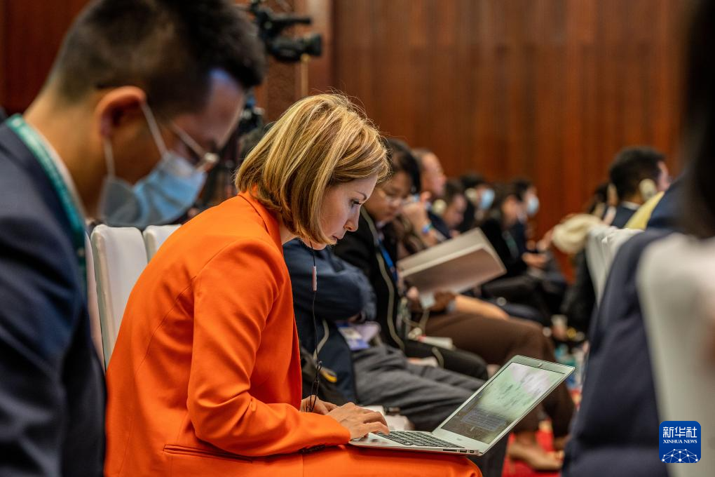 12月5日,記者在云南昆明采訪第五屆世界媒體峰會(云南分會場)暨第二屆大象國際傳播論壇開幕式。新華社記者 胡超 攝