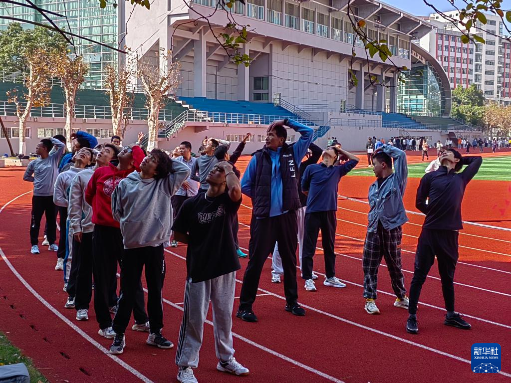 老師帶領學生進行熱身。新華社記者 岳冉冉 攝