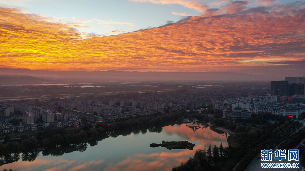 7日清晨,云南省曲靖市的上空出現火燒云美景。在沾益區玉林廣場,瑰麗多彩的朝霞倒映在九龍湖中,仿佛油畫一般,美得令人驚艷。(孫文來)