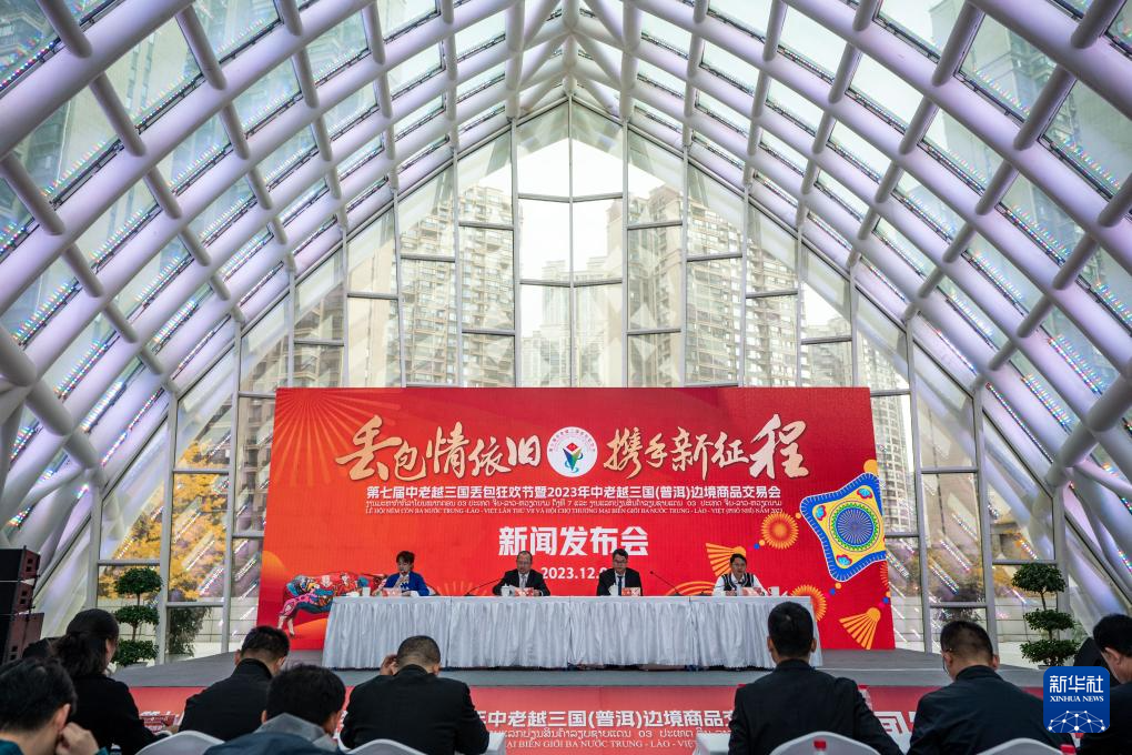 第七屆中老越三國丟包狂歡節暨2023年中老越三國(普洱)邊境商品交易會新聞發布會現場(12月8日攝)。