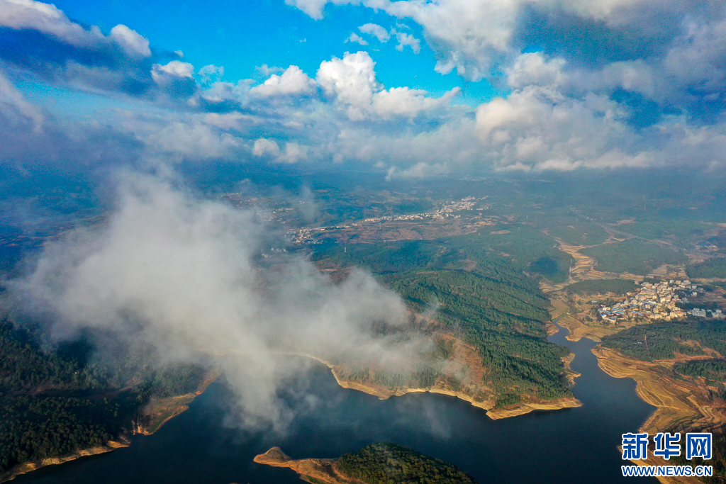 云霧繚繞的瀟湘水庫。新華網發(中共曲靖市委宣傳部供圖)