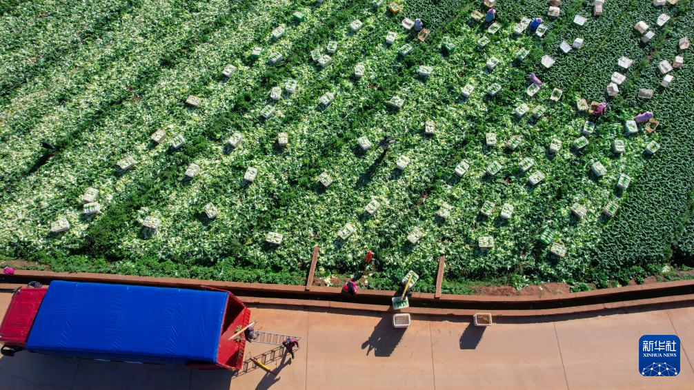 12月18日,農民在云南省曲靖市陸良縣芳華鎮龍潭社區的露天蔬菜種植基地采收新鮮蔬菜(無人機照片)。