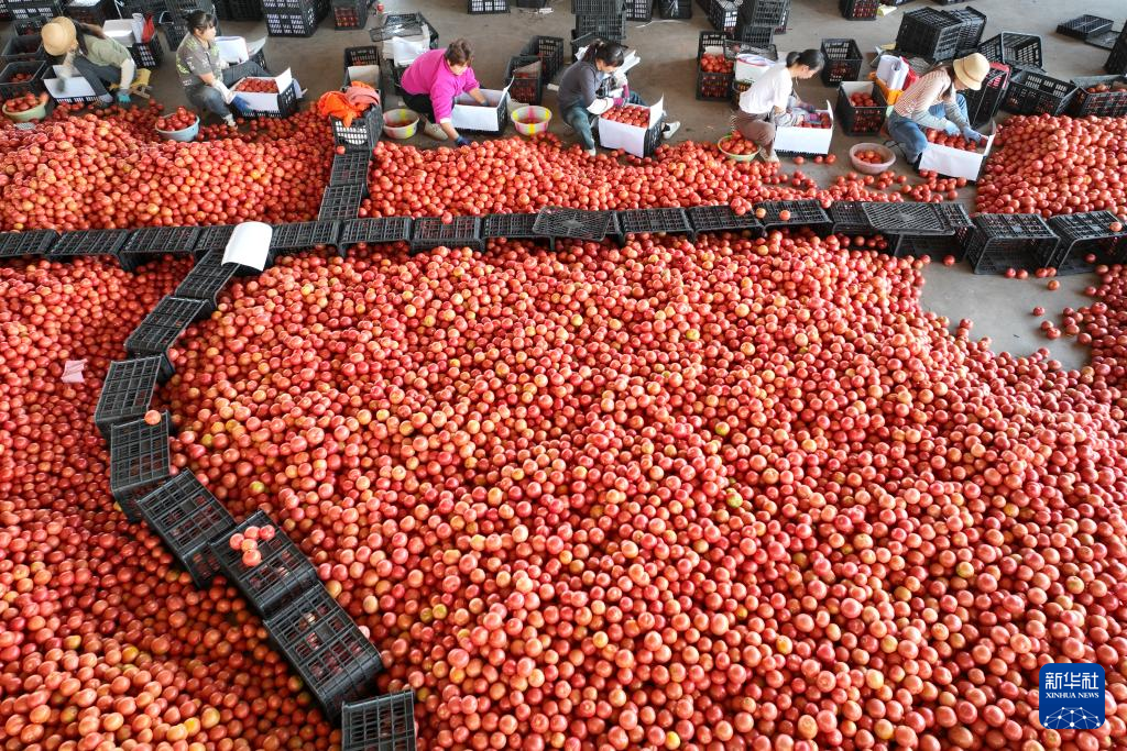12月17日,云南省元謀縣元謀蔬菜批發市場內,工人將西紅柿裝箱外運(無人機照片)。