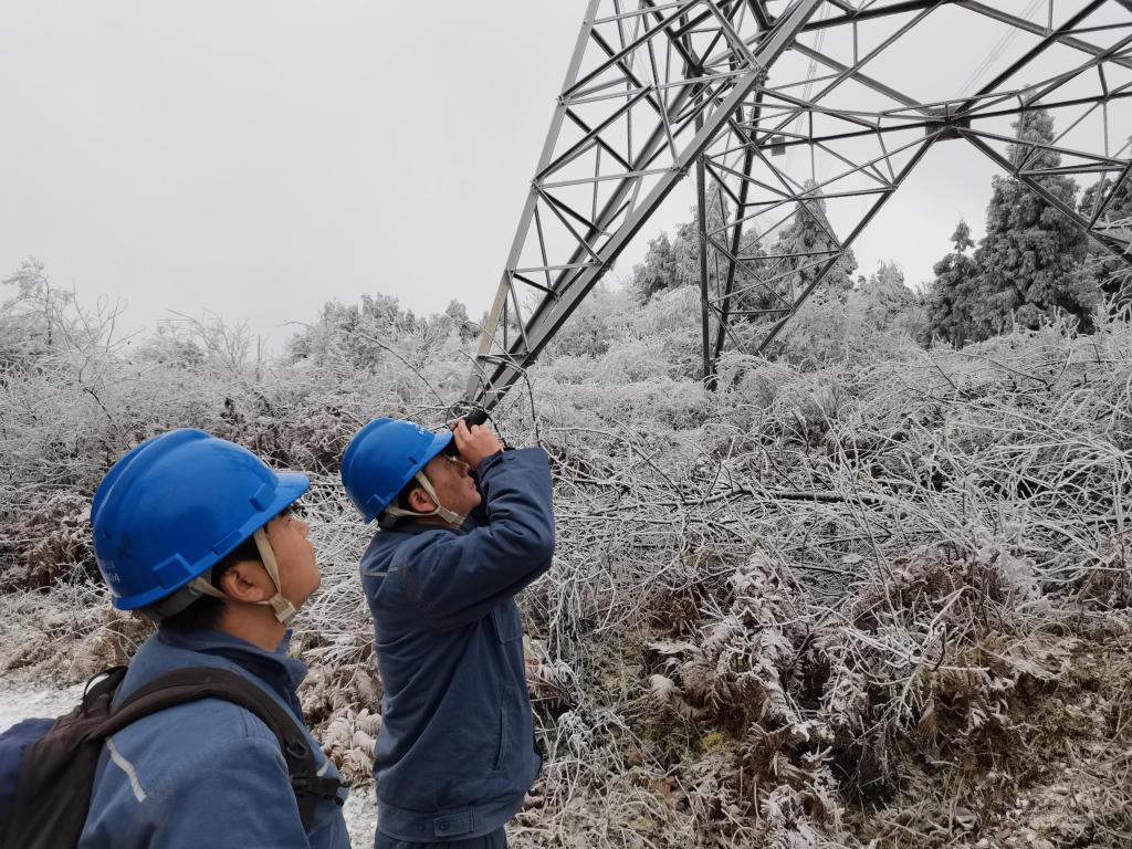 云南送變電公司昭通運檢工作站巡線員在500千伏鎮鶴甲線17號塔開展觀冰工作。張強 攝
