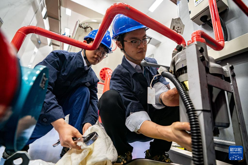 工作人員在右岸地下廠房對水輪發電機組調速器壓力油泵出口過濾器濾芯進行檢查(12月22日攝)。新華社記者 胡超 攝