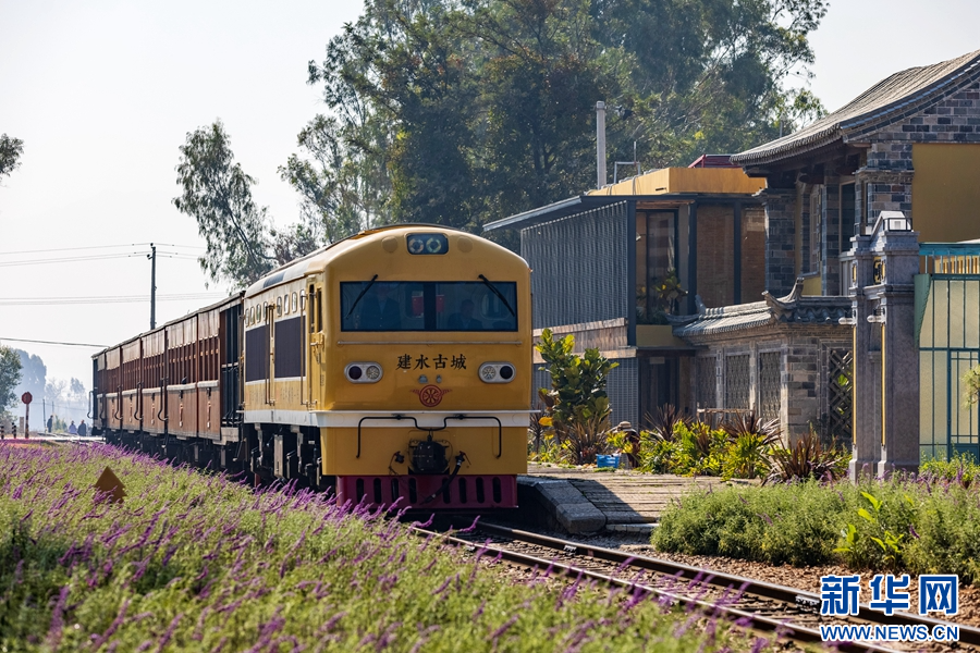 云南省紅河州建水縣,一列“建水古城號”米軌小火車穿行在線路上,列車由東風型米軌內燃機車牽引,經過改造的木質結構車廂,隨手一拍都是美圖,深受游客的喜愛(資料圖)。新華網發(徐章位 攝)