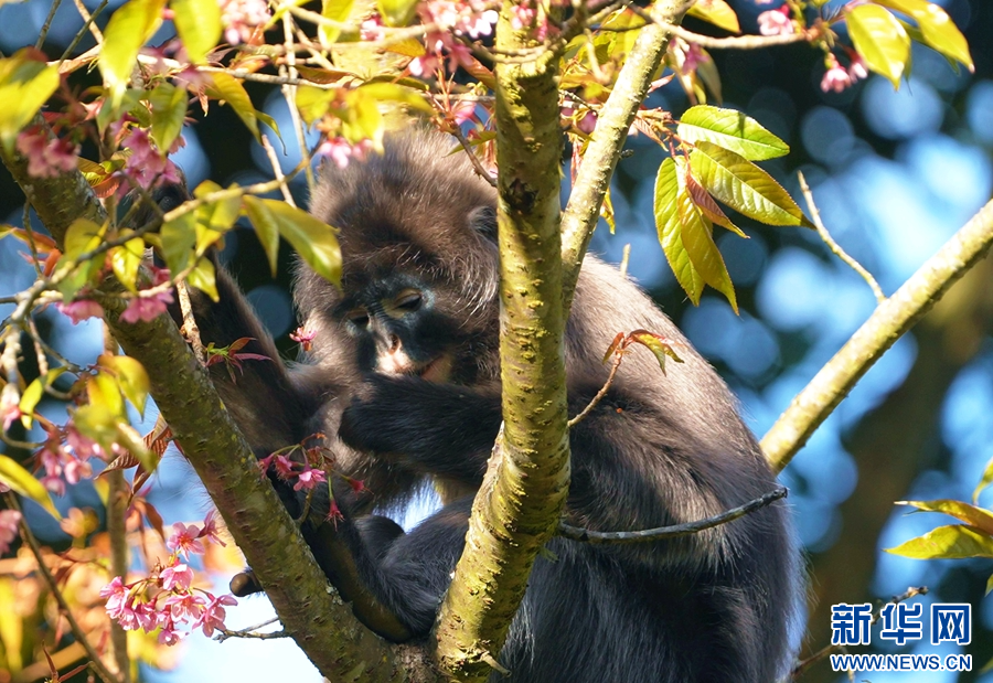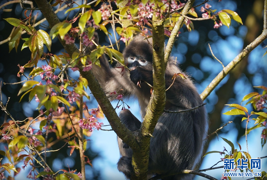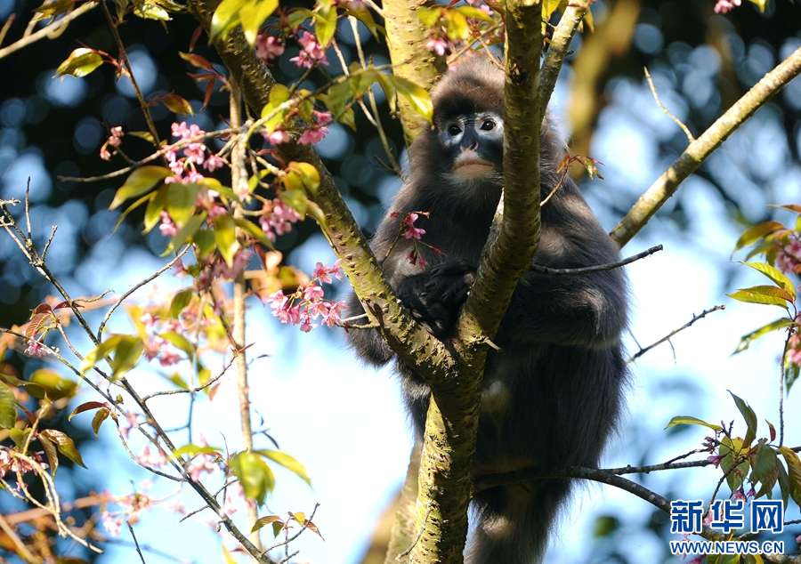 可愛的菲氏葉猴蹲在冬櫻花樹上(1月5日攝)。新華網發(隴川縣融媒體中心供圖)