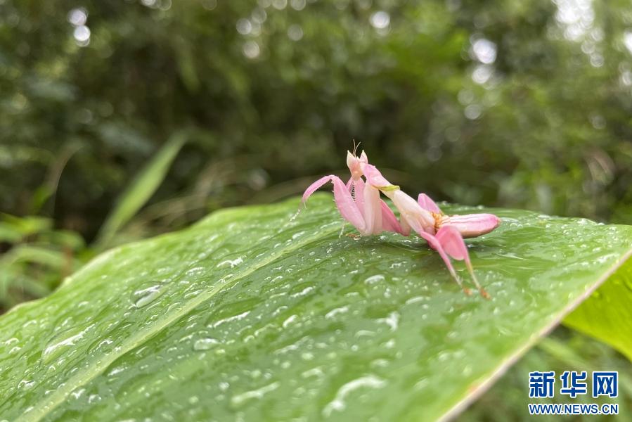 近日,云南省普洱市寧洱縣黎明鄉窯房村村民李康在回家途中偶遇一只粉紅色的螳螂,外形嬌艷如蘭花,十分漂亮。