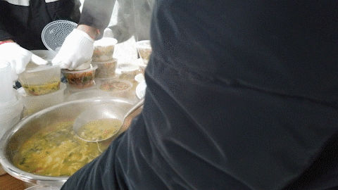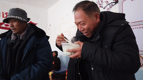 雖然現場還飄著小雪,但臨時安置點內卻熱氣騰騰。12時許,工作人員和志愿者端出了剛炒好的回鍋肉、西紅柿蛋湯等菜品,開始為臨時安置群眾發放午餐。午餐包含4菜1湯,葷素搭配。