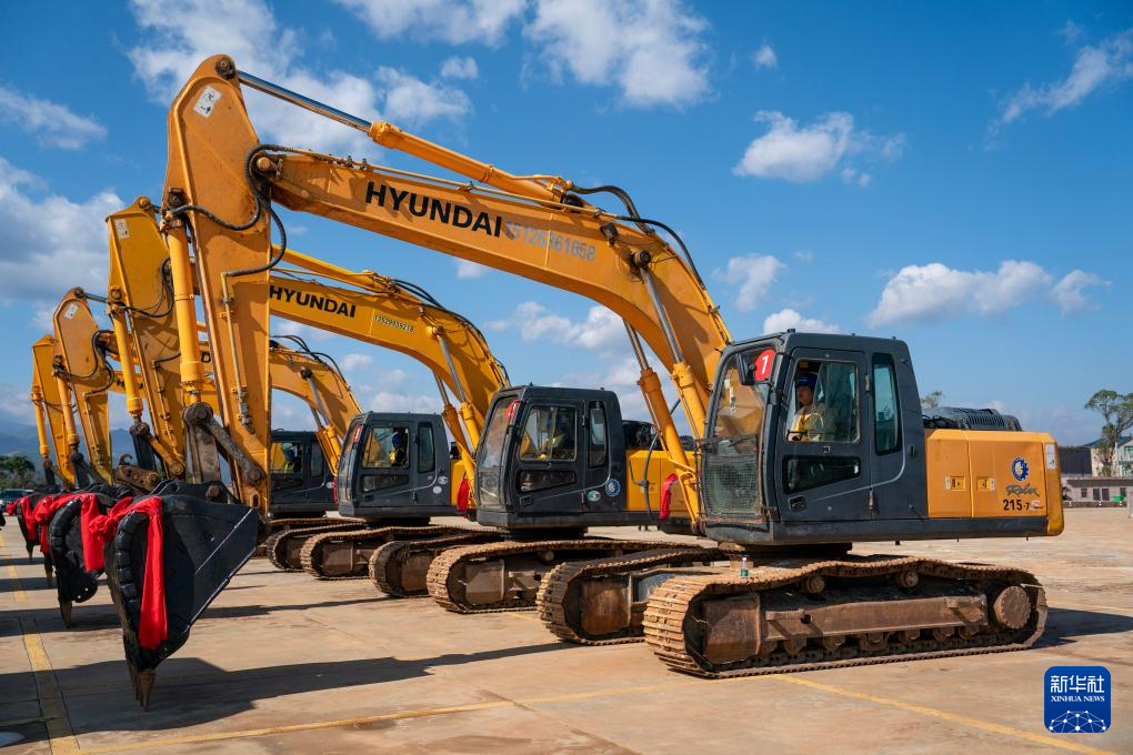 1月30日,大型機械在云南文山文蒙鐵路項目施工現場施工(無人機照片)。