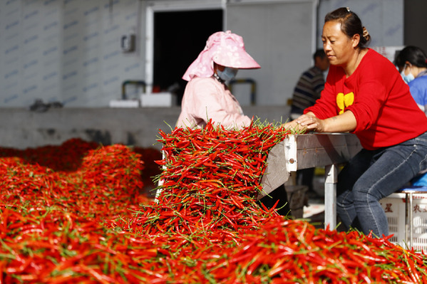 村民在云南省景東縣蔬菜水果交易中心分揀辣椒。記者 何春好 攝
