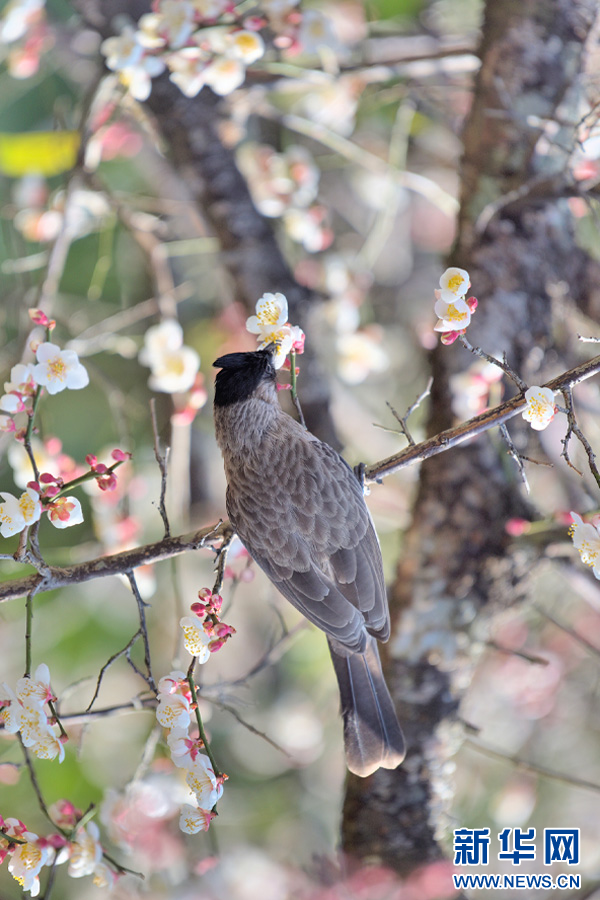 鳥兒停在盛開的梅樹枝頭(1月26日攝)。新華網發(吳再忠 攝)