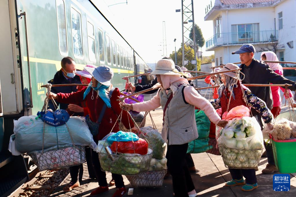 列車剛到云南省曲靖市馬龍區吳官田站,路邊挑扁擔、背背簍的菜農已在等待車門開啟。