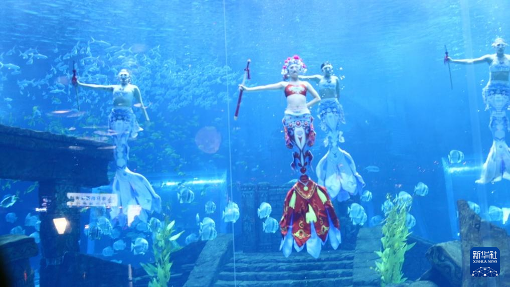 海底“金龍”在水下翩翩起舞、游水戲珠。身著刀馬旦戲服的“美人魚”,手握短劍,英姿颯爽演繹木蘭出征。