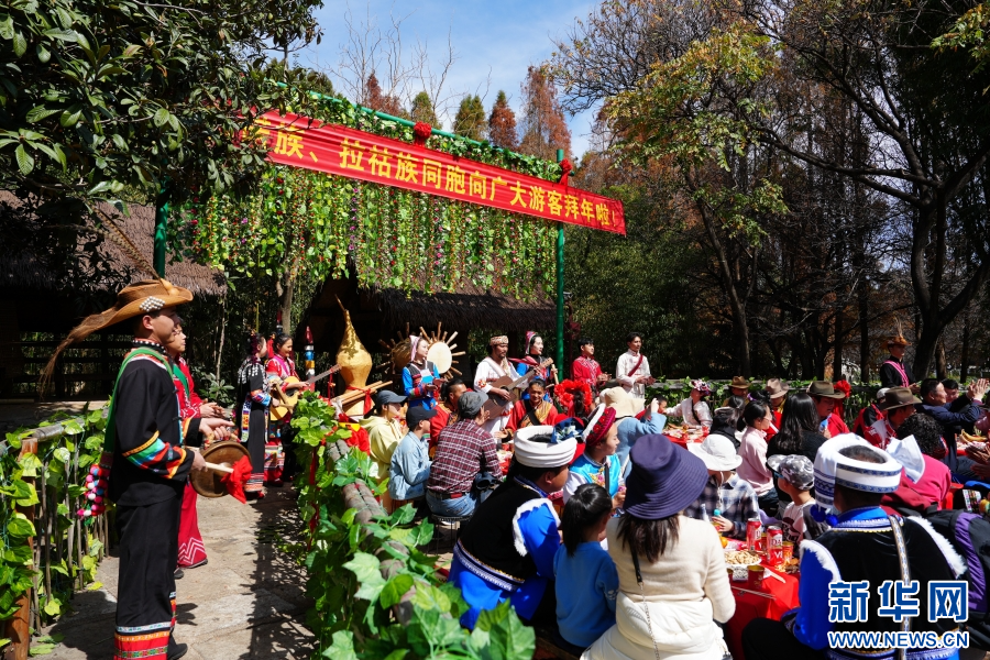 基諾族和拉祜族拜年(2月14日攝)。新華網發(云南民族村供圖)