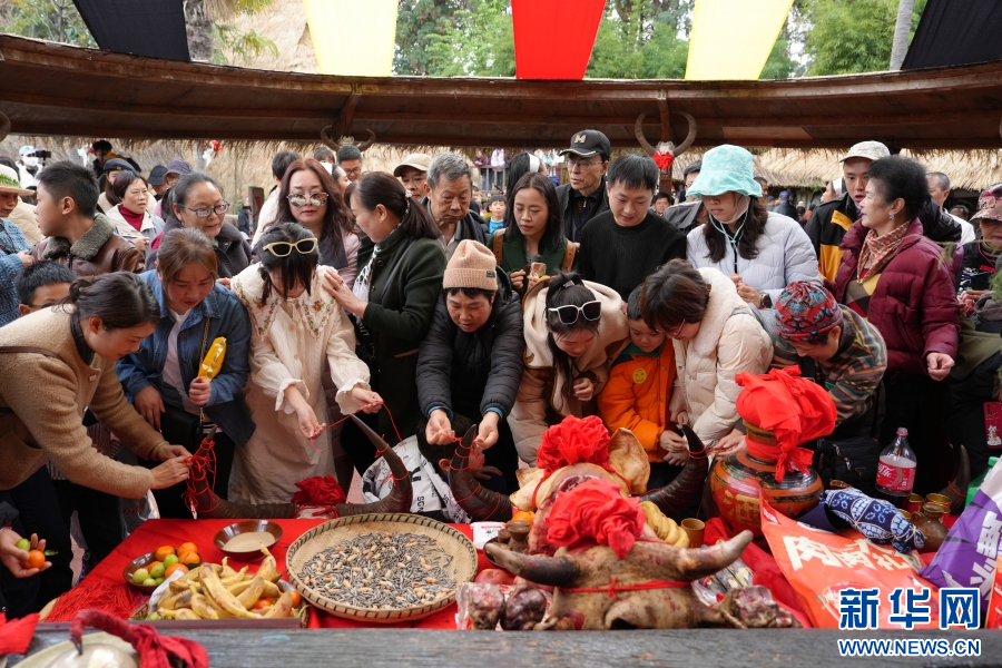 佤寨摸牛頭、拴紅線、送祝福(2月12日攝)。新華網發(云南民族村供圖)