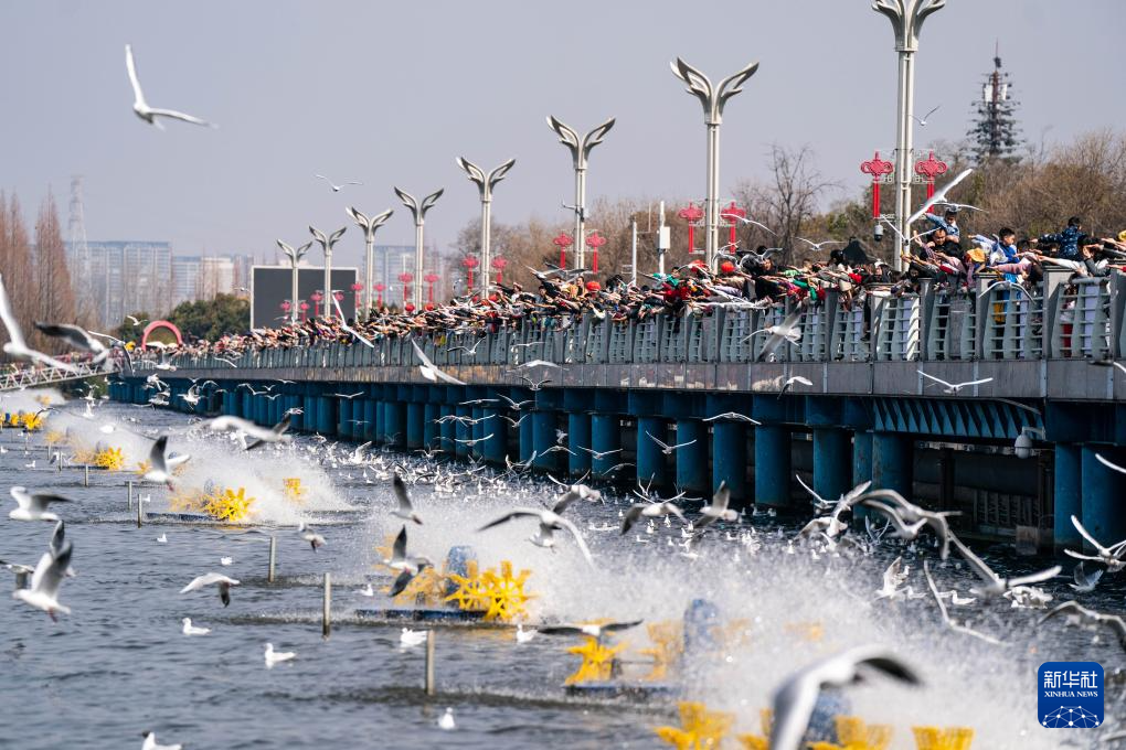 2月15日,人們在昆明市海埂大壩觀賞紅嘴鷗。新華社記者 胡超 攝