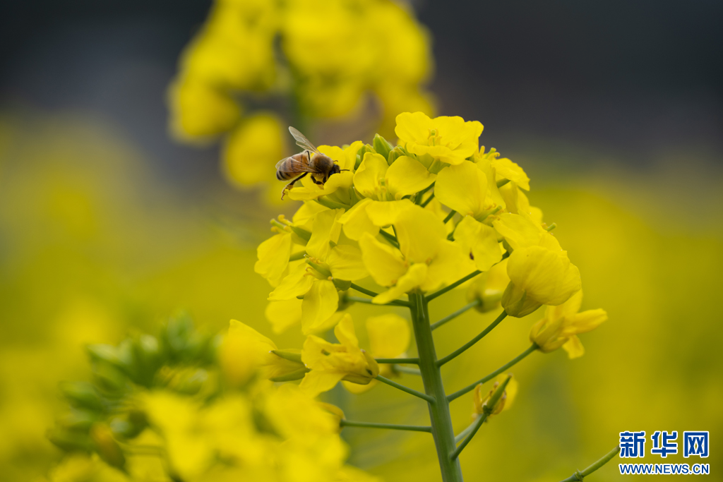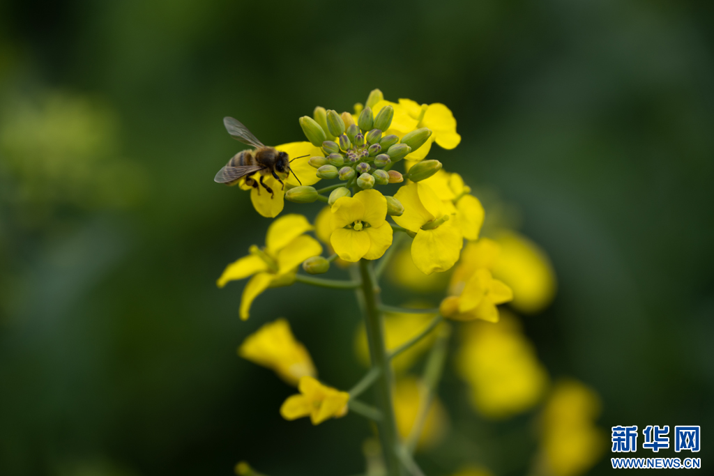 在油菜花間忙碌的蜜蜂(2月12日攝)。新華網發(劉起 攝)