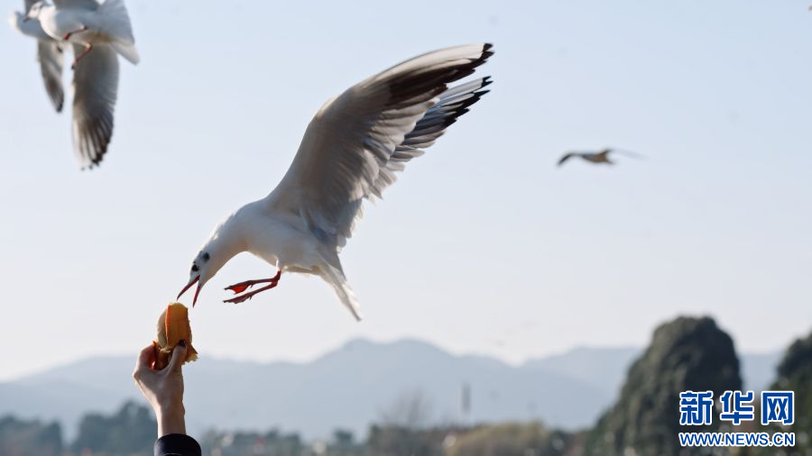 游人在昆明海洪濕地公園觀賞、投喂紅嘴鷗(2月18日攝)。新華網發(劉東 攝)