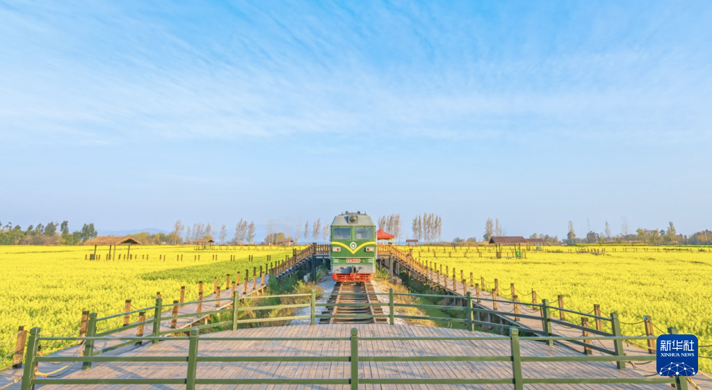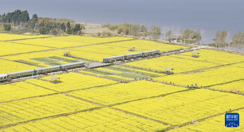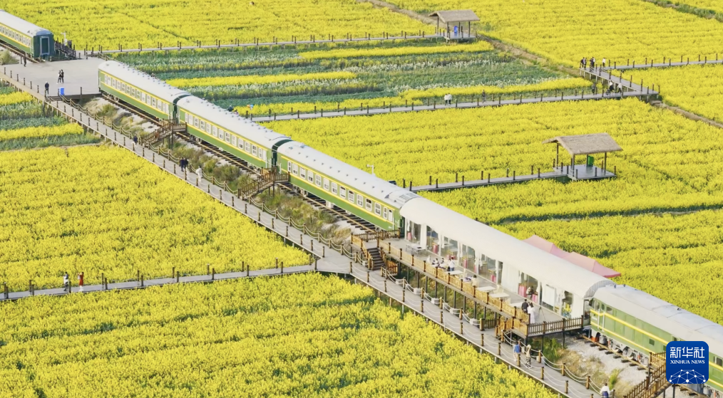 綠皮火車和游人在金色的花海中歡歌,仿佛奏響大地的一曲贊歌,喚起春天的生機與活力,展現鄉村振興發展新氣象。