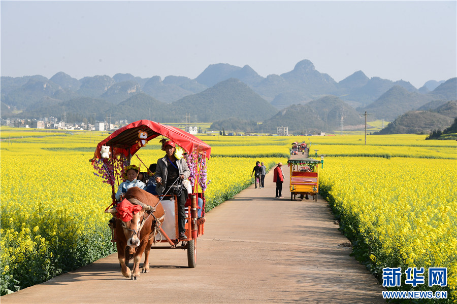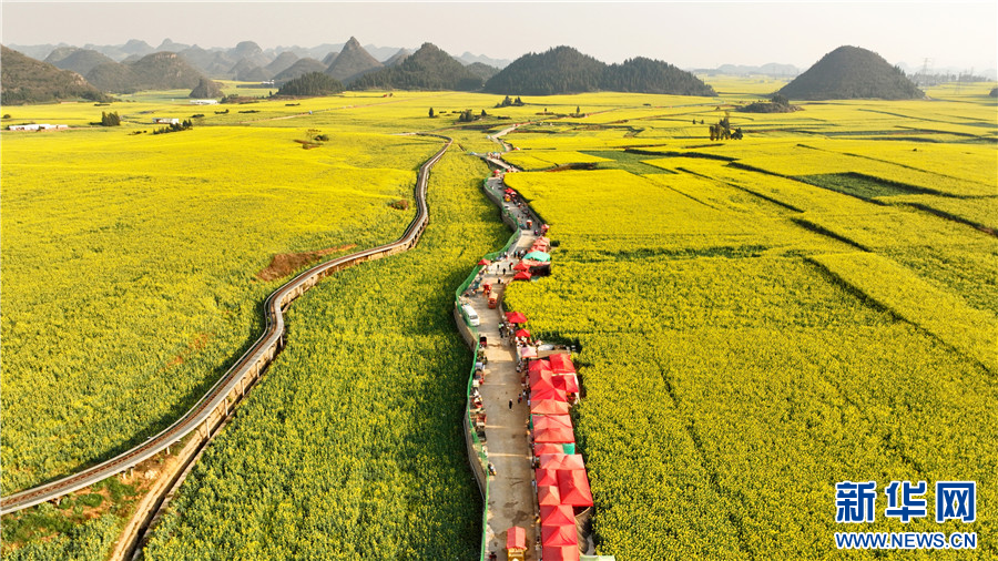 近日,云南省曲靖市羅平縣近百萬畝油菜花競相綻放,微風吹過,油菜花海泛起黃色波浪,與峰林、村莊、樹林相映成趣,勾勒出美麗春色,吸引了大量游客前來賞花游玩。近年來,羅平縣將油菜產業與文旅產業深度融合,帶動鄉村餐飲、民宿等蓬勃發展,助力鄉村振興。新華網發(毛虹 攝)
